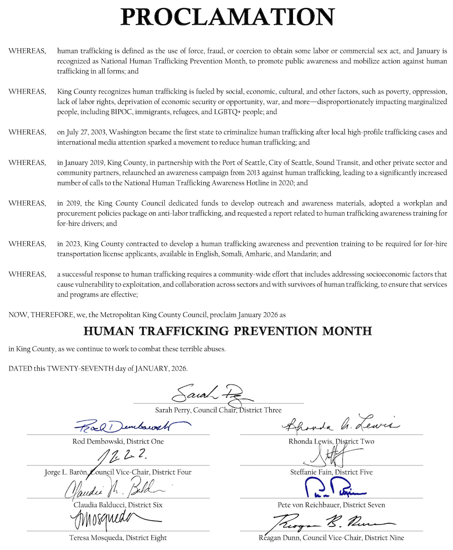 Thank you, Councilmember Mosqueda and the entire King County Council, as well as County employees who work in public health, human service, and adjacent departments, for your continued leadership in addressing human trafficking in our region, and for the opportunity for me to speak to you today.